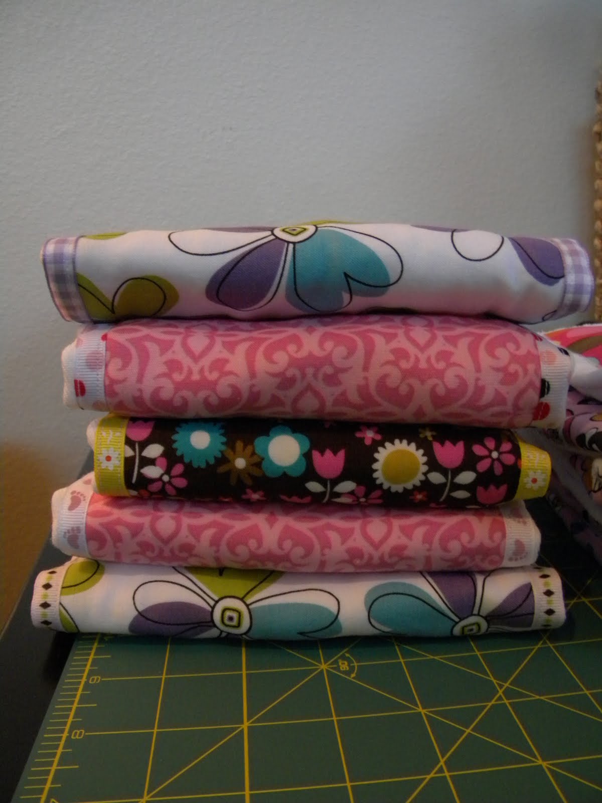 If you have a serger (which I do not), these babies (yes, pun intended) could practically make themselves. You could skip all the folding under nonsense. Just stitch the ribbon to the edges of the fabric, and then trim the ends to line up with the ends of the burp cloth/diaper, and serge the ends.